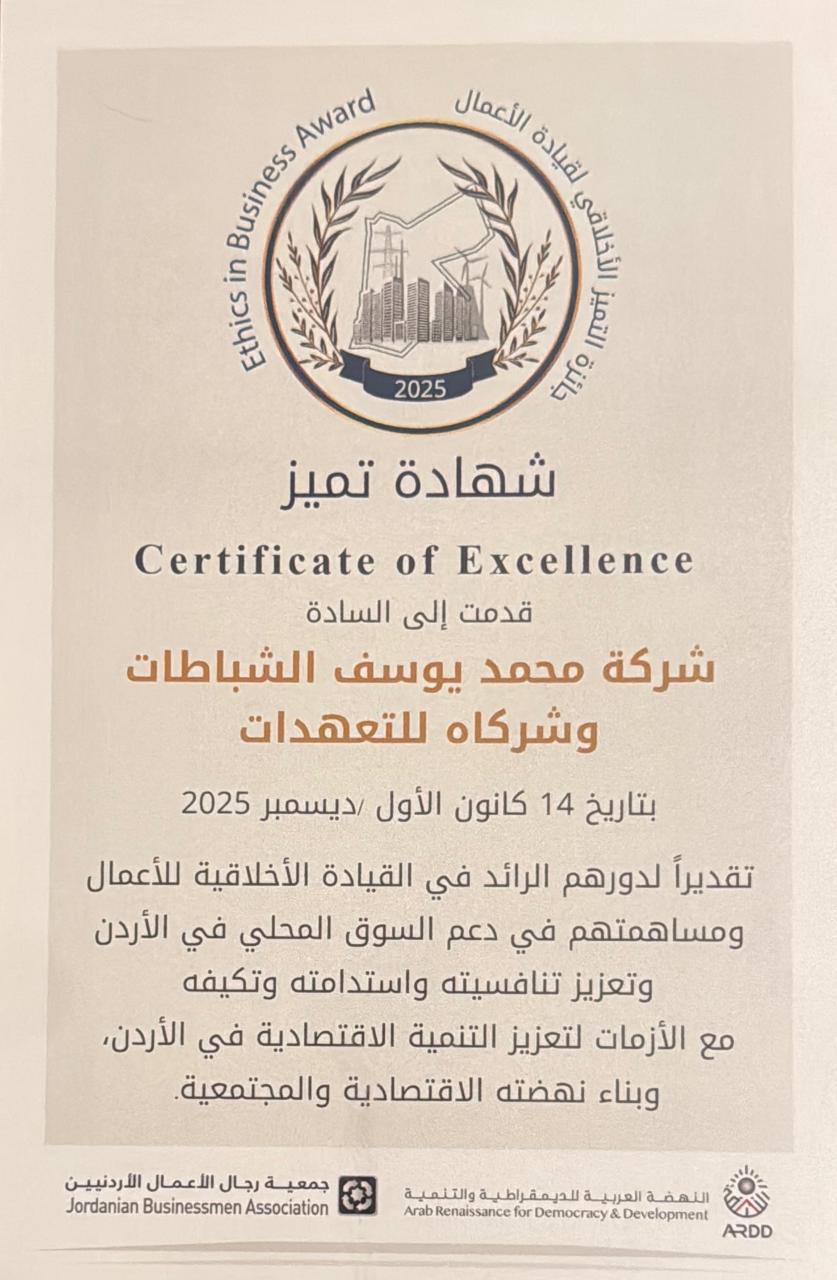 In recognition of their pioneering role in ethical business leadership, and their contribution to supporting the local market in Jordan, enhancing its competitiv ness, sustainability, and resilience in the face of crises, thereby contributing to strengthening economic development in Jordan, and building its economic and societal advancement.